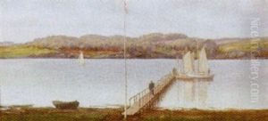 Coastal Scene With An Elderly Man Walking His Dog, In The Background Sailling Ships