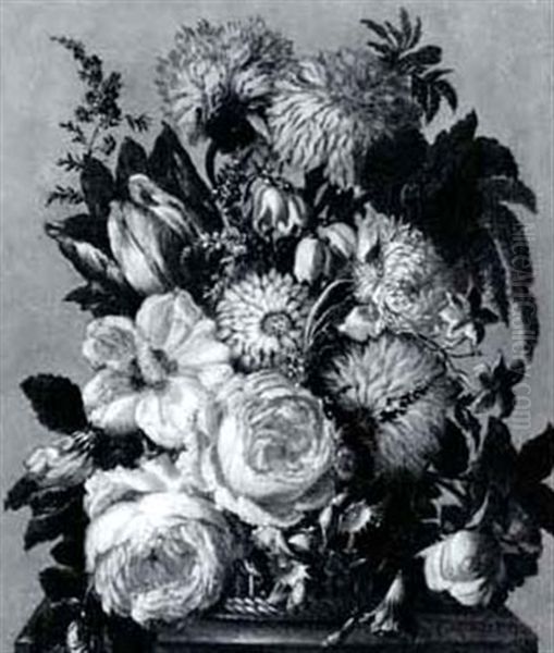Still Life Of Roses, Hibiscus,morning Glory, Hyacinth And Other Flowers In A Basket On A Ledge