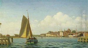 Parti Fra En Dansk Provinsby I Forgrunden Skibe Pa Bedding
