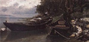 Vor Dem Herannahenden Gewitter Beladt Ein Hirtenpaar Die An Ufer Festgemachten Boote