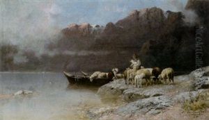 Hirtin Mit Schafen Und Ochsen An Der Tranke Am Seeufer Vorn
