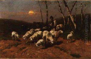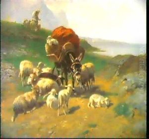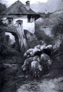 Schafer Mit Seiner Herde Vor Einem Gehoft Im Gebirge