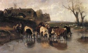 Kuhe An Der Tranke Am Ufer Eines Gebirgssees Mit Ruhender Bauerin Mit Kleinkind Im Schatten Eines Baumes