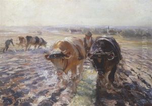 Bauernknabe Mit Pflug Und Ochsen Bei Der Rast