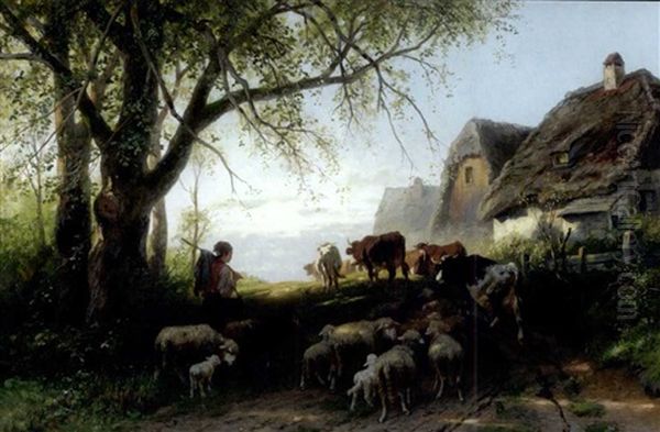 Schafe Und Kuhe Mit Ihrem Hirten Am Rande Eines Dorfes