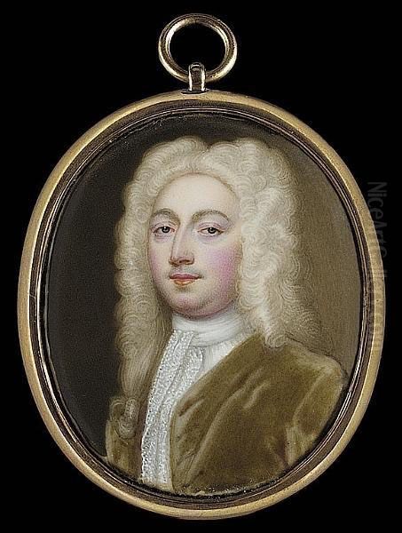 A Gentleman, Wearing Full-bottomed Powdered Wig, Moss-green Coat And Long White Lace Jabot
