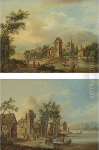 A Pair Of River Landscapes With Travellers On The Left Bank And Figures Boating