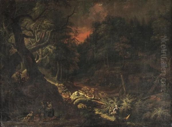 An Evening Wooded Landscape With Figures Conversing On Atrack
