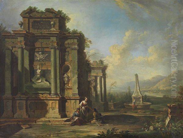Ruinenlandschaft mit Grabmal und Brunnen
