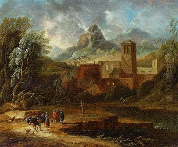 An Italianate Landscape With Travellers And A Packmule On The River Bank