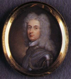 A Gentleman, Wearing Armour, Gold Edged Blue Lining To His Collar And Gardbrace, White Stock And Lace Cravat, His Long Wig Powdered And Curled
