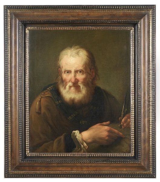 Bildnis Eines Bartigen Mannes, Gelehrter Oder Chronograph, Der In Seiner Linken Einen Zirkel Halt Und Mit Seiner Rechten Hand Auf Einen Vor Ihm Befindlichen Globus Hinweist