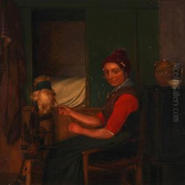 Interior With A Woman At A Spinning Wheel