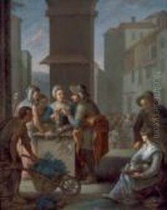 Figures Resting Before Classical Ruins Within A Grotto