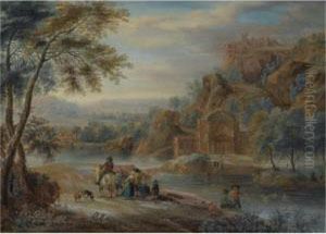 A Mountainous Landscape With Peasants Conversing By A Rocky Outcrop