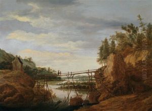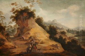 A Rocky River Landscape With Three Figures Conversing In The Foreground