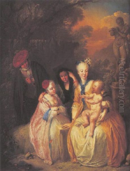 An Elegant Family Seated In A Parkland Landscape With Thier Son Personifying Cupid, A Sculpture Of Orpheus Nearby