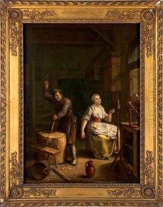 Interieur Mit Einer Dame Am Spinnrad Und Einem Sie Begrusenden Kavalier