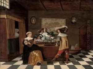 Backgammon Players At A Table With A Lady Playing A Lute In An Interior