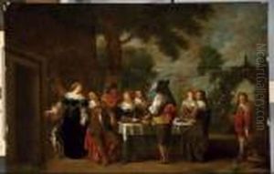 An Elegant Company Feasting On The Terrace Of A Country House