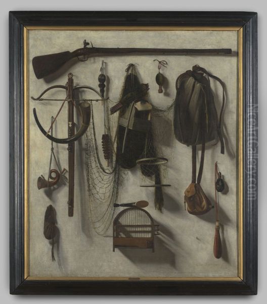Schildering "Jachtstilleven a trompe l'oeil" op linnen door Christoffel Pierson, 1650