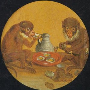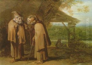Two Monkeys Dressed As Pilgrims Conversing In A Landscape