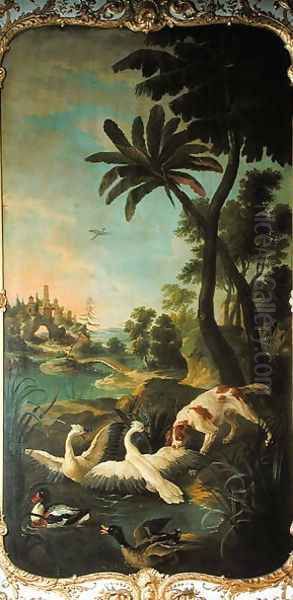 A Spaniel attacking swans a mallard duck and a shelduck panel from the bedroom of Louis Henri I 1692-1740 Prince de Conde