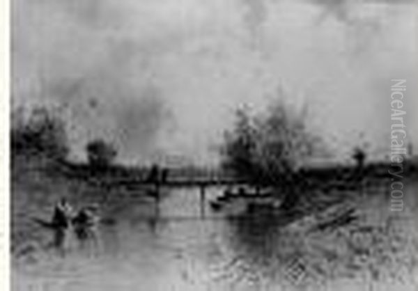 Lavandieres Et Pecheurs Au Bord D'une Riviere