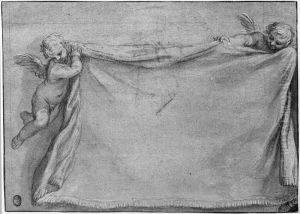 A Child Frightening Another With A Mask, A Swag Of Flowers Above