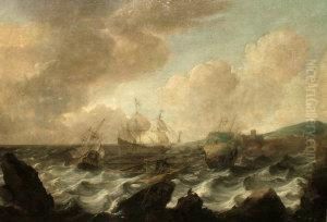 Shipping In A Stormy Sea Oil Painting by Claes Claesz. Wou