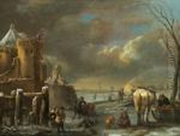 Paesaggio Invernale Con Una Citta Fortificata E Molte Figure
