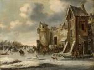 A Winter Landscape With Numerous Figures On A Frozen River Outsidethe Town Walls