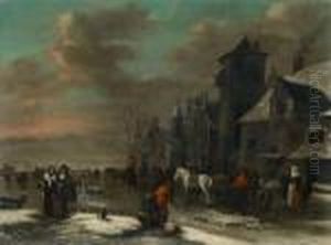 A Winter Landscape With Figures On A Frozen River Outside The Wallsof A Town