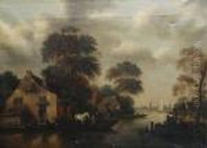 A Riverside Village With A Carriage Crossing A Bridge And Figures Before A Tavern