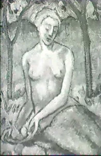 Sitzender Weiblicher Halbakt Mit Fruchteschale Unter Bluhenden Baumen.