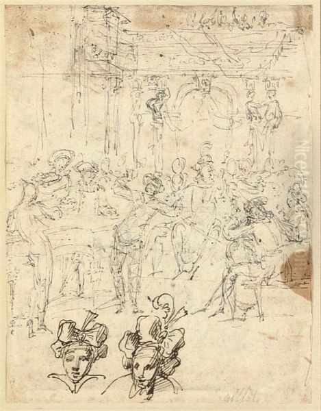 Musicians And A Harlequin Performing At A Banquet