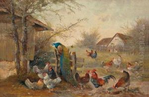 Pfau Mit Huhnern Und Enten In Einem Stall.