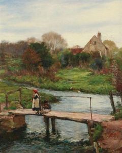 Children On A Bridge With A Cottage