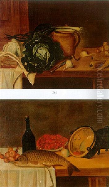 A Fish, A Plate Of Prawns, An Overturned Cauldron, Onions And A Bottle On A Draped Table