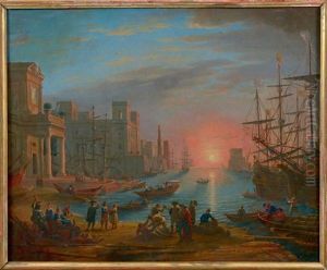 Carpriccio Med En Italiensk Hamn I Skymning Med Villa Medici Ochhandelsman