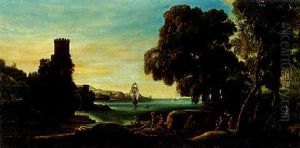 A Mediterranean Coastal Inlet With Classical Figures Playing Music, A Fortress In The Distance