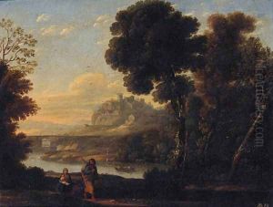 A Classical Landscape With Figures Resting On A Bridge