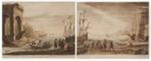 Harbor Scene With Figures And Classical Ruins
