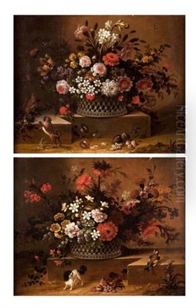 Panier De Fleurs Avec King Charles, Oiseau Et Fruits (+ Panier De Fleurs Dispose Sur Un Entablement Anime De Dogue Et Ecureuil; Pair)