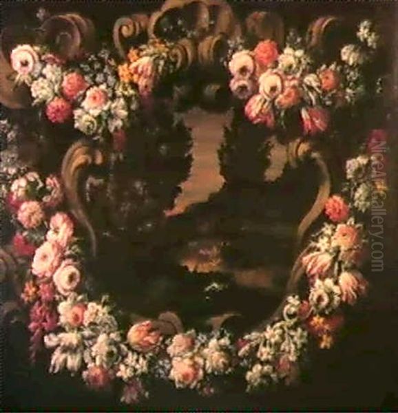 Une Guirlande De Roses, Tulipes, Pivoines Et Autres Fleurs Autour D'un Cartouche De Pierre Et Dans La Reserve