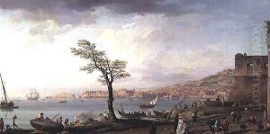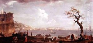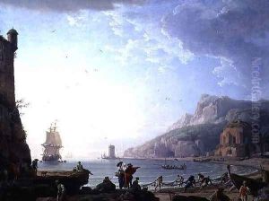 A Mediterranean Coastal Scene With Fishermen Bringing In Their Boats And A Man Of War At Anchor Beyond