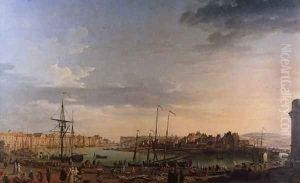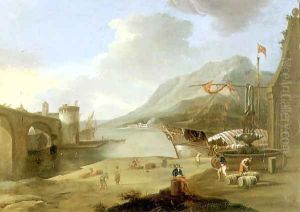 A Coastal Landscape At Dusk With Fishermen And Women In The Foreground, Sailors Disembarking From A Ship Beyond