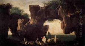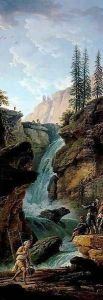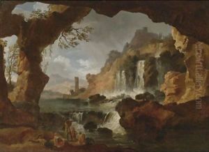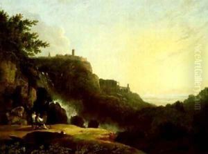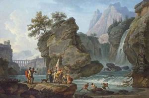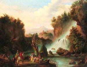 Travellers before the falls of Tivoli with the Temple of Vesta beyond