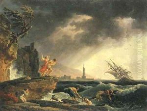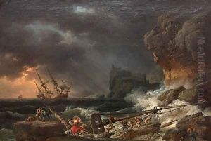 A stormy coastal seascape with survivors from a shipwreck on a rocky outcrop