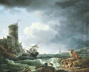 A Mediterranean rocky coastal landscape with survivors from a shipwreck, by a fortified tower